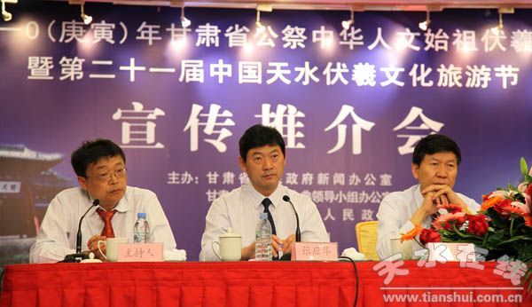 天水市委常委、宣传部长王光庆向各位媒体记者及嘉宾介绍了2010(庚寅)年甘肃省公祭中华人文始祖伏羲大典暨第二十一届天水伏羲文化旅游节的情况。