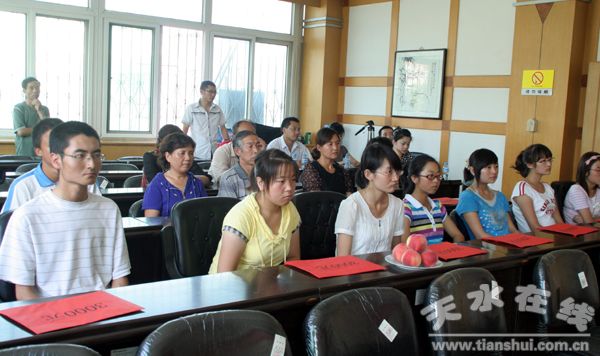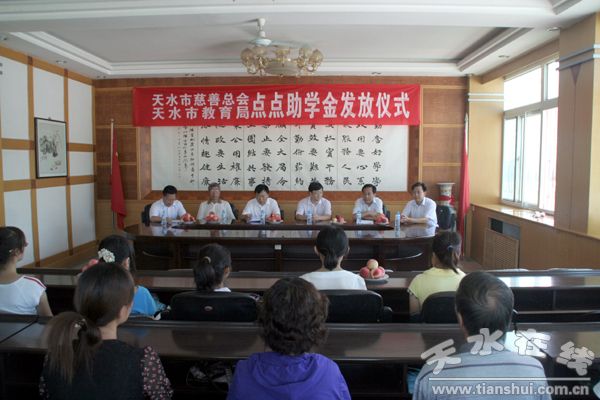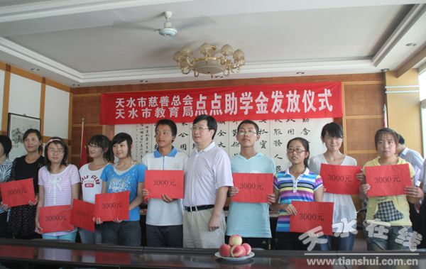 7月29日,天水市慈善总会、市教育局“点点助学基金”发放仪式在市一中隆重举行。现供职于广州南方医院的秦州籍王明芳博士充分发扬中华民族扶危济困,赈灾救难的优良传统,为家乡贫困大学生募集援助6.58万元。现场为2009年天水市考上大学的谢亚盼、杨利萍等13名贫困学生每人发放了3000元助学金。