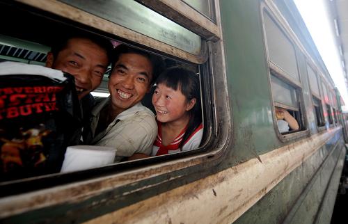 8月20日,天水火车站几位登上专列的赴疆棉农在等待发车。新华社记者 聂建江 摄