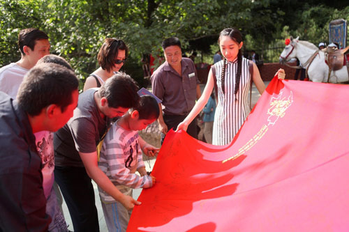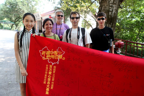 8月28日,“祈福中国,爱传百城”发起者祈福女孩李姗殷及志愿者一行人抵达甘肃境内,在麦积山下与国内爱心游客一起举行了爱心大签名,呼吁社会各界共同保护我们伟大的文明遗迹。