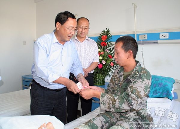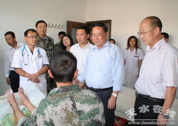 8月31日下午,天水市委常委、政法委书记韩岱成带领市委办、市政府办、民政局相关负责人来到市皮肤医院看望慰问参加娘娘坝抗洪抢险的天水预备役旅勤务队战士杨锐。