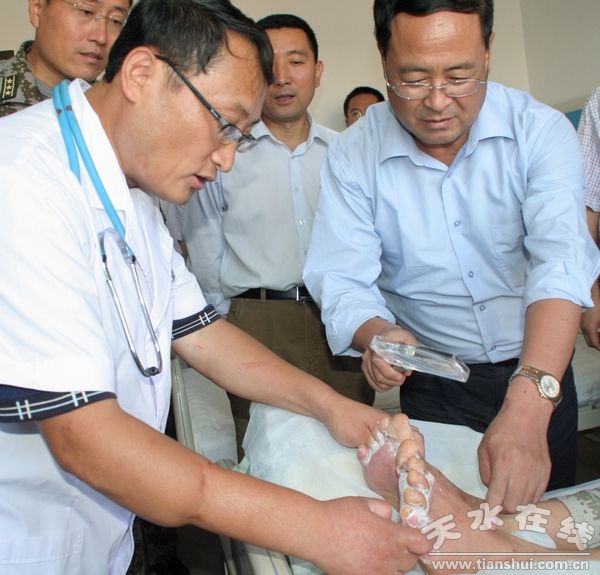韩岱成说,在李子园防汛最危急时刻,天水预备役旅迅速开赴抗洪一线,为胜利迎战洪水作出重要贡献。他代表市委、市人大、市政府、市政协和全市340万人民群众看望慰问可爱的抗洪战士。他要求医院要全力做好杨锐的治疗,使他尽快康复重返工作岗位。
