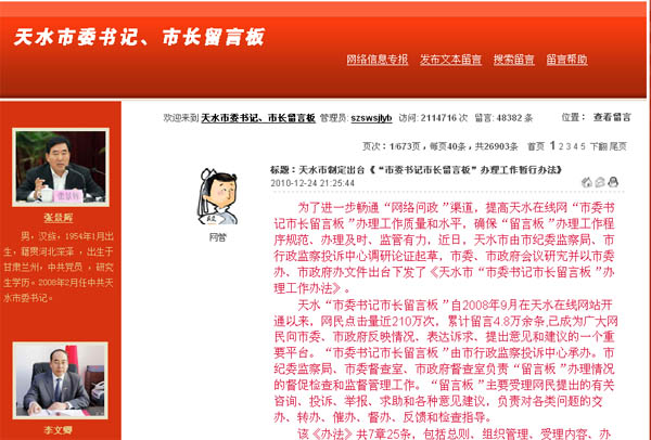 为了进一步畅通“网络问政”渠道,提高天水在线“市委书记、市长留言板”办理工作质量和水平,确保“留言板”办理工作程序规范、办理及时、监管有力,近日,由市纪委、监察局、市行政监察投诉中心调研论证起草,市委、市政府会议研究并以市委办、市政府办文件出台下发了《天水市“市委书记、市长留言板”办理工作办法》。