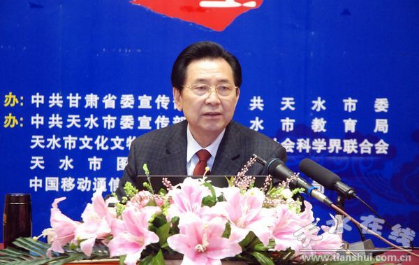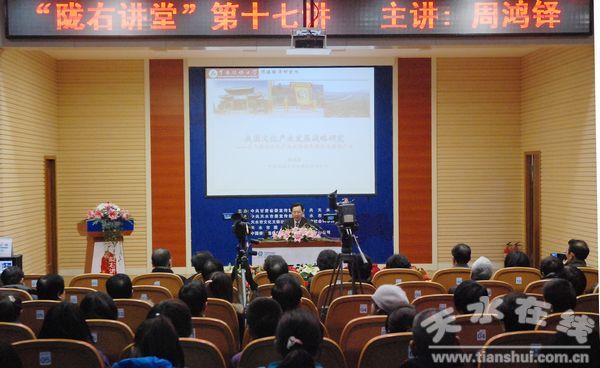 讲座现场,周鸿铎从文化产业与文化创意产业、发达国家文化产业发展的现状分析入手,深入分析了我市丰富的文化资源,以及发展文化产业所具备的得天独厚的优势。周鸿铎说,我市因“天河注水”而得名,这本身就是一个品牌,同时,我市还拥有着深厚的历史文化资源,比如三阳川文化、人文始祖文化、麦积山文化等,这些都是我市独一无二的文化财富,也是我市发展文化产业的特色资源。因此,从文化产业的角度来讲,应该从多种方式加大宣传力度,向外推介天水,进一步提高我市的知名度。同时,根据文化产业发展的要求和我市文化产业资源的现状,周鸿铎还提出了“‘123’天水文化产业发展模式”,即建立中国天水卦台山文化产业集聚区;举办中国国际“天河”文化节、中华人文始祖——伏羲文化节;举办三阳川文化产业论坛、人文始祖文化产业论坛、麦积山文化产业论坛。