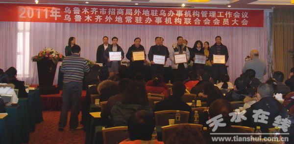 2011年1月6日,乌鲁木齐市招高局、乌鲁木齐外地常驻办事机构联合会召开了工作会议,表彰了2010年度优秀及先进外地驻乌办事处和会员单位,参加会议的有外地驻乌的280家单位300多人,大会由天水市政府驻新疆办事处主任、联合会副会长赵来喜同志主持。