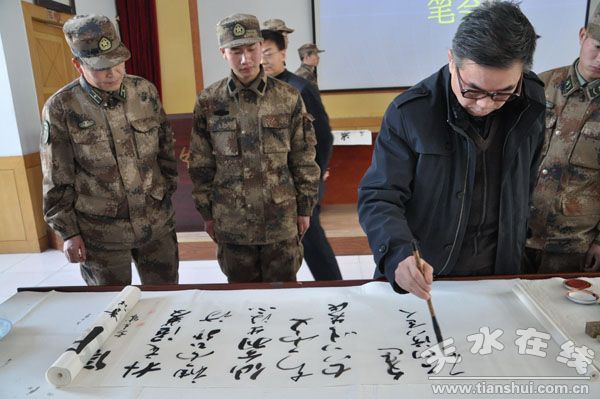 春节将至,1月14日,天水市文联、市民政局、市双拥办、市书法家协会、市美术家协会开展书画进军营活动,书画名家走进驻市68212部队,以书画的形式向全体官兵送去了节日的祝福和良好的祝愿。