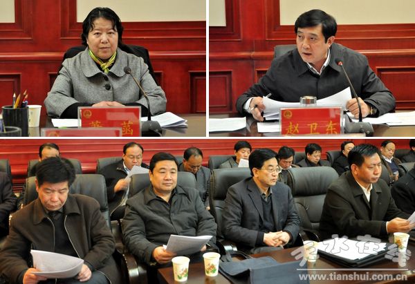 会议听取了全市一季度经济运行有关情况、关于贯彻落实全省招商引资工作总结表彰会议精神和召开全市招商引资工作会议情况、2011年公祭伏羲大典·伏羲文化旅游节暨中国西部商品交易会筹备工作情况、关于进一步加强地方志工作有关事宜、2010年度全市安全生产工作先进单位和先进个人表彰事宜的汇报;审议了《关于进一步加快保障性住房建设加强房地产市场调控工作实施意见》、《关于切实转变发展方式推动农业农村工作再上新台阶的实施意见》、《关于推进新一轮社会主义新农村建设的实施意见》、《关于鼓励农业科技人员到农业生产一线创业及开展结对服务的意见》。