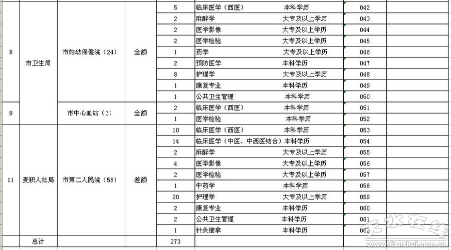 本次公开招聘的计划共273名。其中:市一医院57名,市三医院45名,市四医院30名,市五医院6名,市疾控中心7名,市中心血站3名,市中医院31名,市卫校12名,市妇保院24名,市二医院58人。