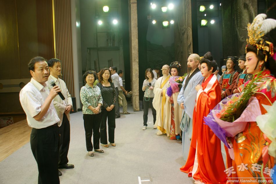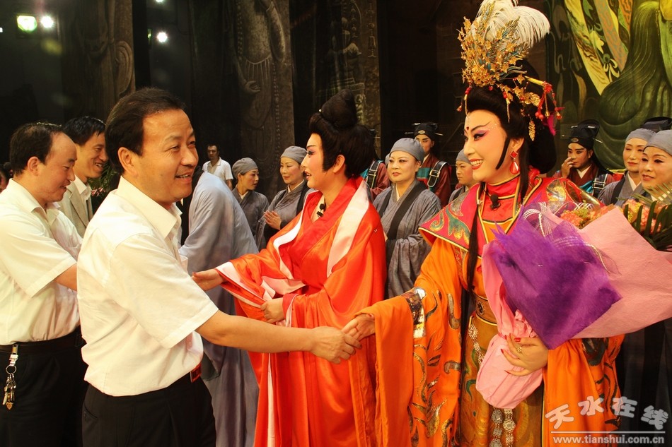 市委常委、副市长郭奇若观看了演出,并在演出结束后上台接见演职人员。郭奇若对《麦积圣歌》B版B角的成功演出给予了充分肯定。他指出《麦积圣歌》这台戏在市委、市政府和社会各方面的支持下,在演职人员的共同努力下,已经提前实现了拟定“三步走”战略的前两步,连续获得大奖,在省内外产生了较大的影响。这次在关注文化建设、崇尚文化、有战略眼光的企业家的赞助下B版B角演出两场,演出很成功,代表了天水的实力和水平,《麦积圣歌》今后还有很长的路要走。郭奇若要求文化部门和《麦积圣歌》剧组要继续努力,以这次B版B角演出为起点,精心筹划,进军新疆,从河西走廊一路演来。同时,及早准备做好省内巡演,增加演出场次,扩大剧目影响。经过我们坚持不懈的努力,争取将《麦积圣歌》打造成为天水靓丽的城市文化名片,让其走出国门,走向世界。为宣传天水,提升天水的知名度,推动天水文化旅游产业的发展做出新的贡献。