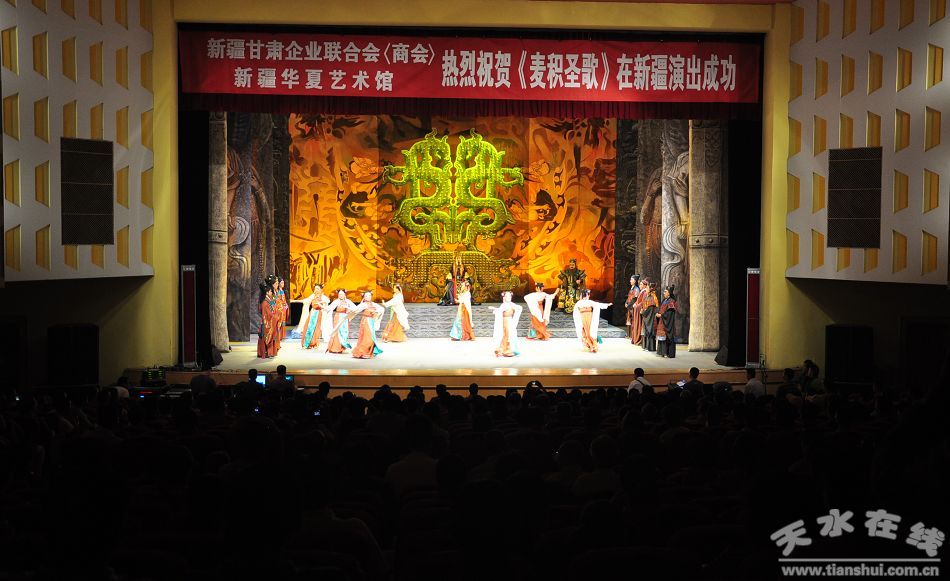 天水在线乌鲁木齐讯(综合《工人时报》(记者 张骞)报道) 8月12日晚,位于新疆首府乌鲁木齐市的十月影剧院蓝宝石厅人头攒动,热闹非凡,“敦煌行•丝绸之路国际旅游节”主要活动之一的大型历史秦剧《麦积圣歌》巡演在这里隆重上演。这也是《麦积圣歌》剧组赴新疆、嘉峪关、张掖等地巡演的第一站。
