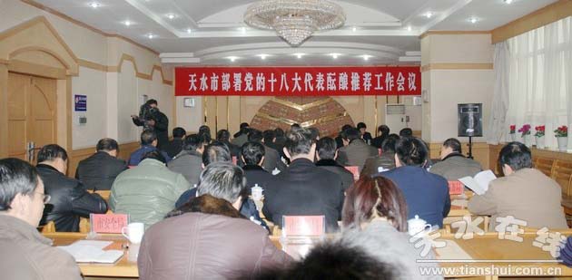 12月29日,中共天水市委召开部署党的十八大代表酝酿推荐工作会议,传达学习全省会议精神,安排部署我市酝酿推荐工作。各县区、市直及驻市单位党组织负责人参加了会议。