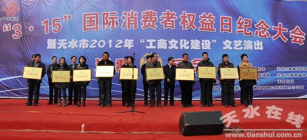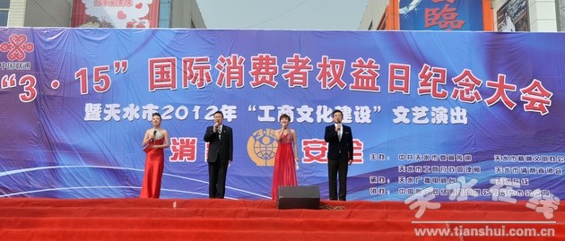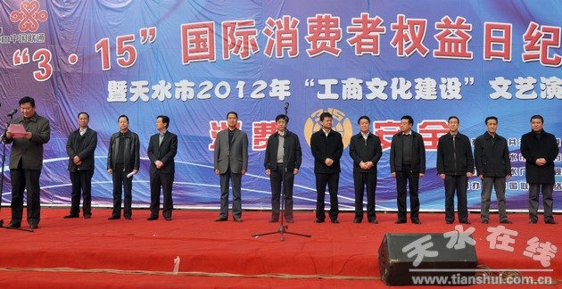 3月16日上午,天水市“3.15”国际消费者权益日纪念大会暨天水市2012年“工商文化建设”文艺演出在龙城广场举行。市委常委、市委秘书长蒋晓强,市人大常委会副主任安永,市政协副主席窦正安,市长助理吕淙江出席大会。
