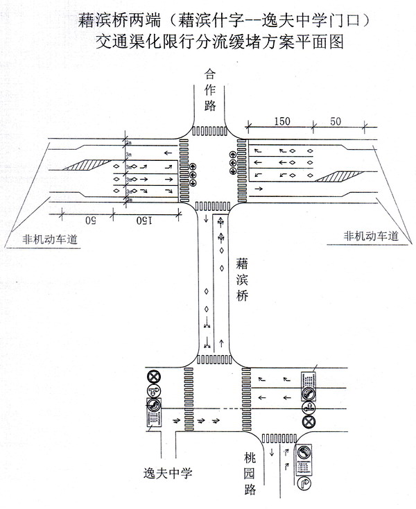 藉滨桥南端即逸夫中学门口段拟实行“限时禁左”的限行分流措施。拟定在藉滨桥南端即逸夫中学门口段实行“限时禁左”措施,即在每天7:30-19:30这个时段内,对藉滨桥南端逸夫中学门口东、西进口和桃园路北口设立禁左标志 ,限制车辆左转弯通行(公交车除外)、避免左行车流与其它车流的直接冲突,让车辆在东升路、天庆路、迎宾桥等其它路段进行小循环,均摊车流;同时改造现有标线,藉滨桥南端路口处拓展成三车道,东面向西、北方向车流直行、右转上桥的车道分开,西面向东方向车流直、右一个车道,从而有效解决该路口的交通拥堵问题。