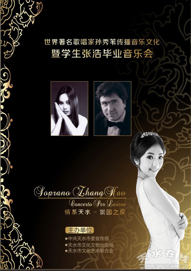 世界著名女高音歌唱家孙秀苇传播音乐文化暨学生张浩毕业音乐会将于2012年5月5日晚8时在天水秦州剧院隆重举办,本活动由甘肃景园集团冠名赞助。