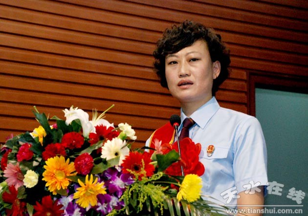 (市法院党组成员、政治部主任李蘋代表荣获“全国法院文化建设示范单位”的市中级人民法院作报告)