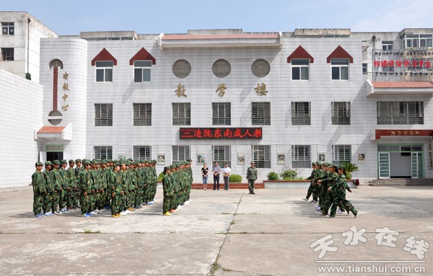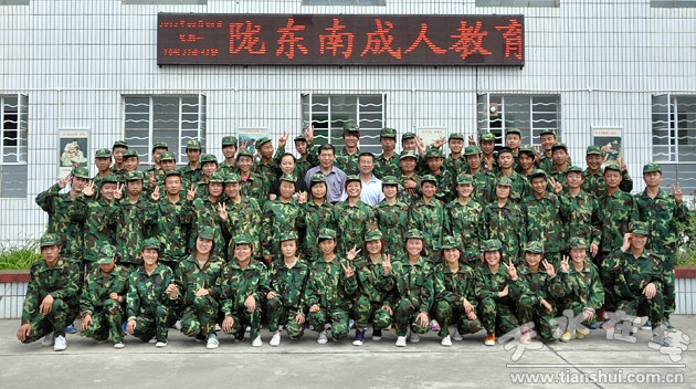 8月6日,天水市2012年扶贫开发教育移民工程首期培训班60名学员正在接受军训,经过文化知识、技能培训后,他们将在浙江就业。