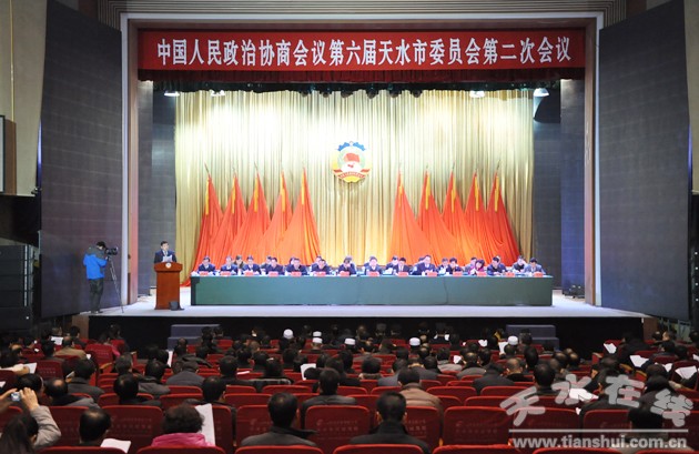(12月26日下午,政协第六届天水市委员会第二次会议举行第二次全体会议,听取市政协委员就事关全市转型跨越发展的重大问题和涉及群众切身利益的现实问题的意见建议。 会议由大会执行主席安志宏主持。大会执行主席杨维俊、王钦锡、安志宏、杨发元、何道华、雷传昌、白晓玲、窦正安、蒲军、张克强、马百龄、王振宇在主席台前排就座。 应邀出席会议并在主席台就座的市党政军领导有:市委书记马世忠,市委副书记、市长王锐,市委常委、常务副市长郭奇若,副市长雷鸣、温利平、霍卫平、王钧、徐庆宏、杨建莹,市长助理吕淙江,各民主党派和工商联负责人。 会议还邀请市委、市政府有关部门负责人和部分省政协委员列席会议。 )