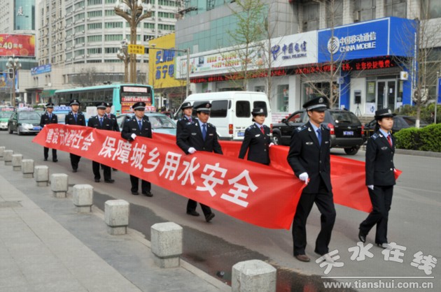 为在全社会进一步强化水忧患意识和水法制观念,营造良好的水事环境,市、区两级水务部门紧紧围绕“节约保护水资源,大力建设生态文明”的宣传主题,举办了丰富多彩的宣传纪念活动。一是在龙城广场举办“世界水日”和“中国水周”宣传纪念主题活动,采取悬挂横幅、设立宣传展版开展了《水法》、《水土保持法》等水法规宣传活动;二是设立水法律法规咨询服务台,发放宣传资料,现场解答市民咨询;三是在《天水日报》刊发专版文章,进行深度宣传;四是出动宣传车辆和组织水法规宣传队进行巡回宣传。据统计,纪念活动当天,共出动宣传车1辆,设立水法规宣传咨询台2处,悬挂宣传横幅25幅,展出节水型社会建设、水土保持及水行政执法等内容的宣传展版35块,发放宣传资料6300多份、宣传画报560份,接待咨询55人次。通过多种形式的宣传教育活动,有效推进了依法行政、依法治水进程,为全市社会经济可持续发展营造了良好的用水环境。