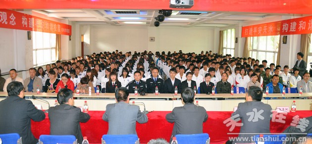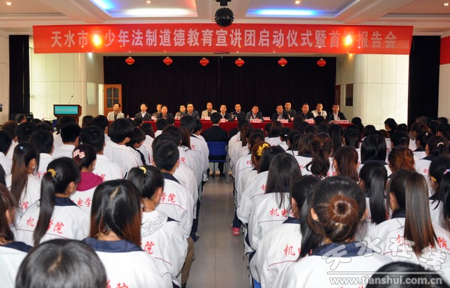 为深入贯彻落实党的十八大精神和“六五”普法规划,切实增强我市青少年法制观念,有力提升青少年思想道德觉悟,全面提高青少年自护意识能力,4月19日下午,由市委宣传部、市综治办、团市委、市公安局、市人民检察院、市中级人民法院、市教育局、市司法局联合开展的天水市青少年法制道德教育宣讲团启动仪式暨首场报告会在甘肃机电学院隆重举行。