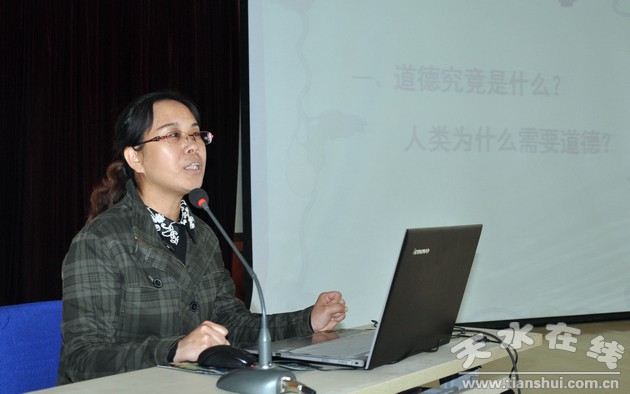 在启动仪式结束后,天水师范学院经济与社会管理学院副教授杨喜梅老师为师生们带来了题为《德耀人生——道德使人生更幸福》的首场报告会。报告会上,杨喜梅老师围绕中国的传统美德进行讲解,从“孝道”讲到“礼貌”,从“诚信”讲到“慎独”,既有生动的故事,又有流行的网络语言,受到广大师生的热烈欢迎,现场时时响起热烈的掌声和开心的笑声。