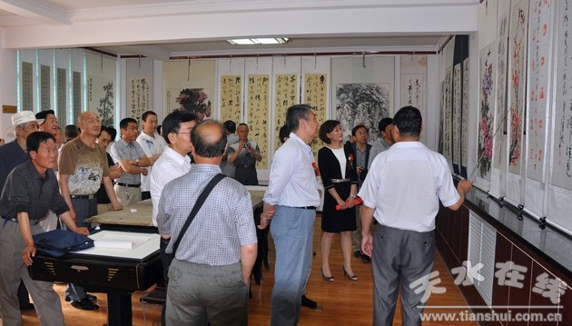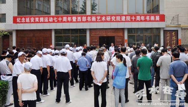 6月18,纪念延安双拥运动七十周年暨西部书画艺术研究院建院十周年书画展在天水市军队离退休干部休养所开展。书画展共展出书画作品105幅,其中书法作品62幅,绘画作品40幅,篆刻作品3幅。天水市老年书画研究会会长、市政协原主席乔正风出席开展仪式并参观了展览。