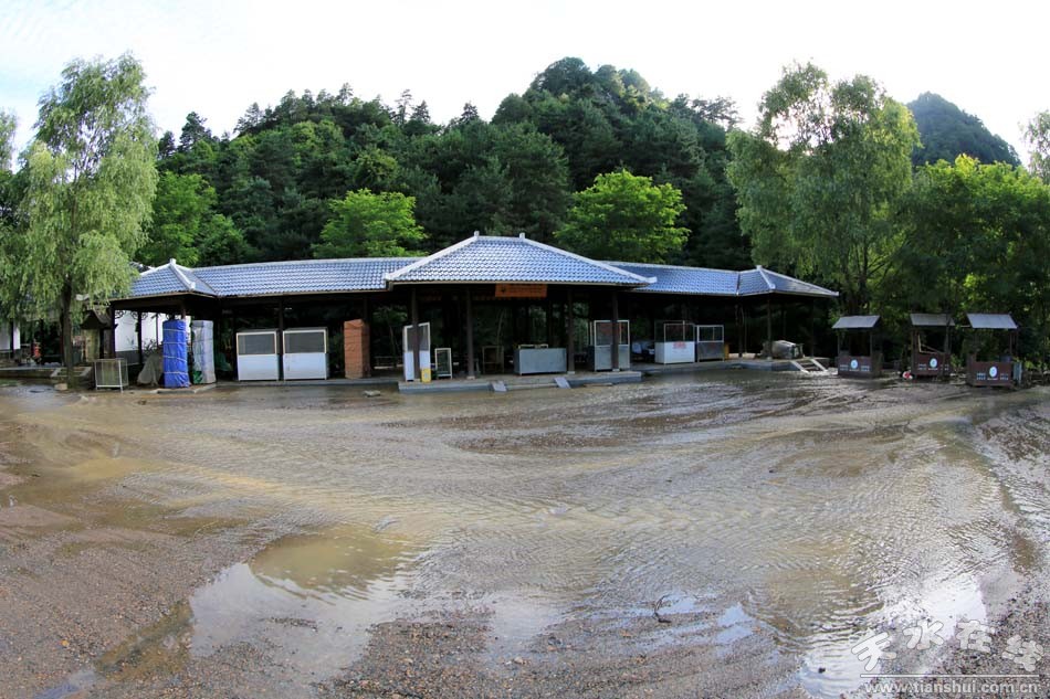 ▲仙人崖景区仙人湖下面的旅游设施全部被冲毁。(天水在线6月23日摄影)
