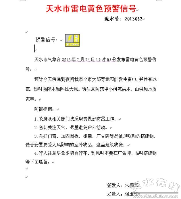·天水气象台7月24日19时05分发布雷电黄色预警信号