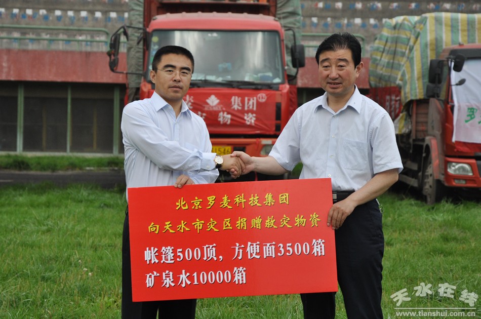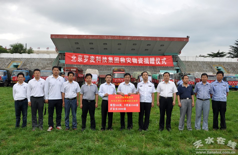 在南山体育场举行的简短捐赠仪式上,北京罗麦科技集团启明公益委员会常务副理事长陶国林表示,天水暴雨山洪泥石流灾害发生后,甘肃省公安厅、甘肃省工商局致函罗麦科技集团,希望能够向灾区捐助救灾物资,罗麦科技集团董事长汪静指示,立即筹集价值100万元的矿泉水、方便面、帐篷等救灾物资,紧急运住灾区,以表达对灾区人民的深情厚谊,帮助灾区人民渡过难关。