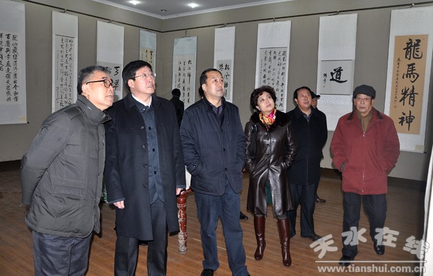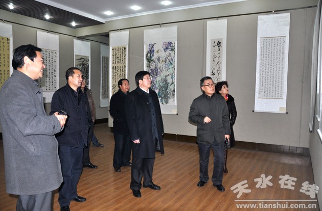 2月17日上午,天水市委副书记、市政协主席宋尚有来到市文化馆,参观了市政协书画研究院第二届书画作品展。 市政协副主席宋博华、白晓玲一同参观。