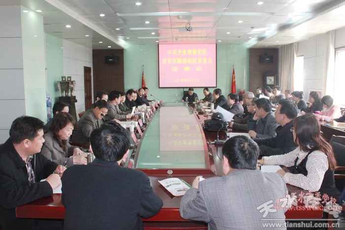 3月13日下午,天水市党的群众路线教育实践活动第八督导组组长牛升斗在市委党校主持召开党的群众路线教育实践活动征求意见座谈会,听取干部职工对我校领导班子和领导干部作风建设以及开展好教育实践活动等方面的意见和建议。市第八督导组成员、校领导班子、各处室负责人、干部职工代表、党校离退休老干部代表应邀出席会议。