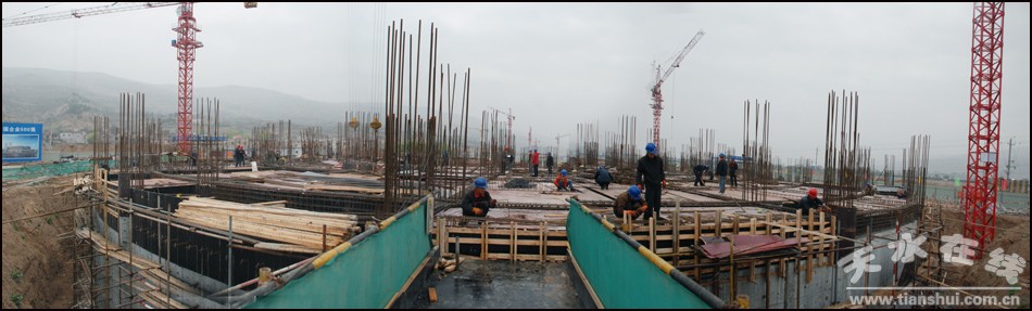 4月16日,在天水商贸城项目施工工地,工人们在进行钢筋安装。