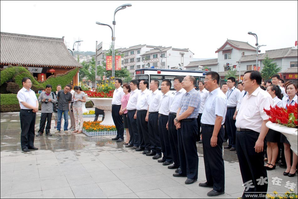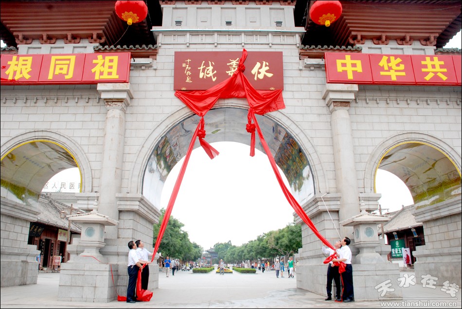 6月18日上午,天水市四大组织领导王锐、柴金祥、杨维俊、宋尚有在伏羲城的东西牌坊为著名书法家欧阳中石先生题铭的“伏羲城”匾牌进行揭彩。 市领导蒋晓强、彭鸿嘉、赵建强、白晓玲,市政府秘书长逯克宗出席揭匾仪式。副市长张建杰主持揭匾仪式。