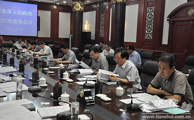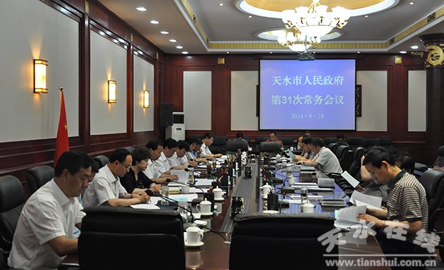 6月18日,天水市委副书记、市长杨维俊主持召开市政府第31次常务会议。会议学习了《甘肃省规范行政处罚自由裁量权规定》,讨论了拟提请市第六届人大常委会第21次会议审议的《天水市2013年市级财政决算草案的报告》、《天水市2013年度市级财政预算执行和其他财政收支情况的审计工作报告》,审议了《2014年天水市发展循环经济工作方案》和《天水市新型城镇化试点工作实施方案》,听取了2014年公祭伏羲大典暨伏羲文化旅游节筹备工作、第十三届环青海湖国际公路自行车赛天水赛段筹备工作、大型原创历史剧《大秦文公》创作排练有关情况的汇报。