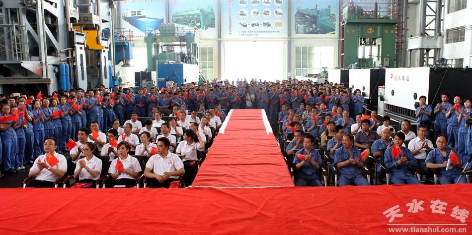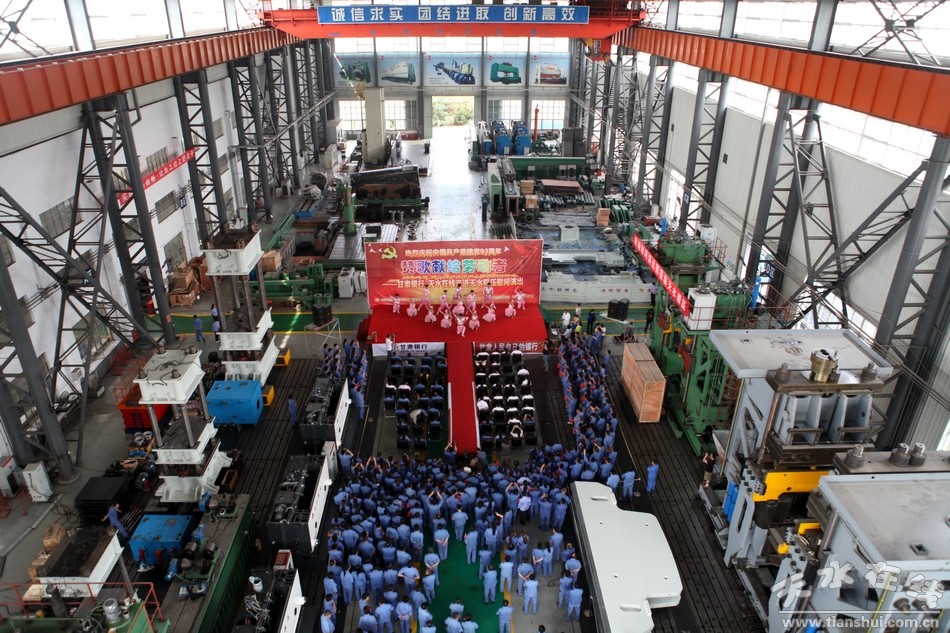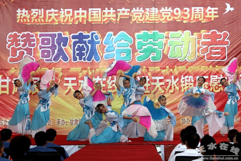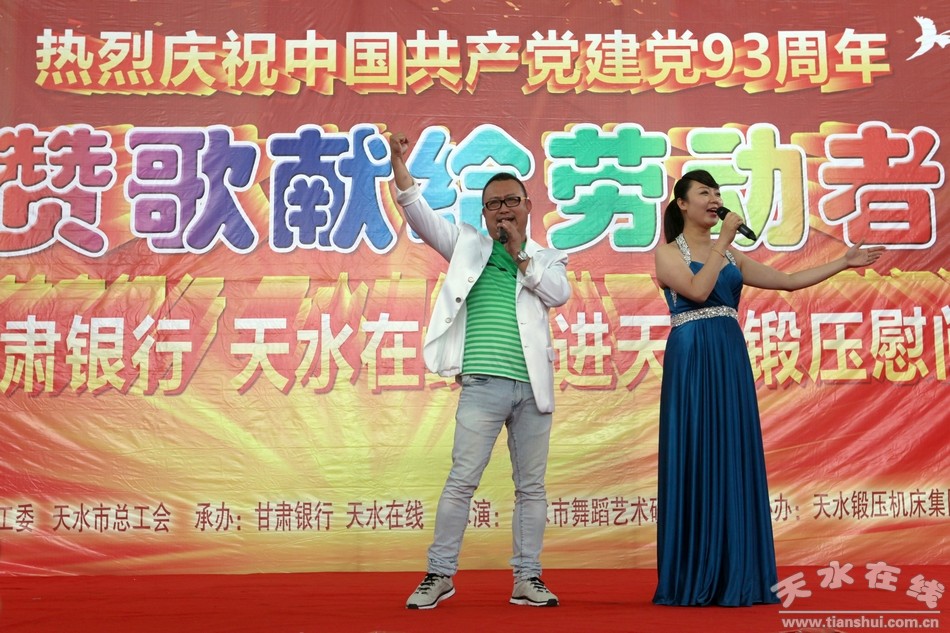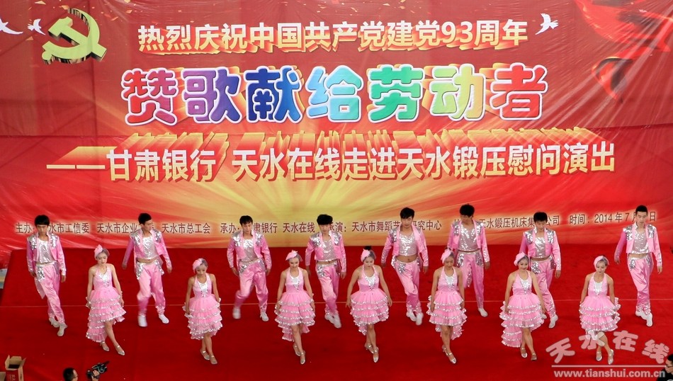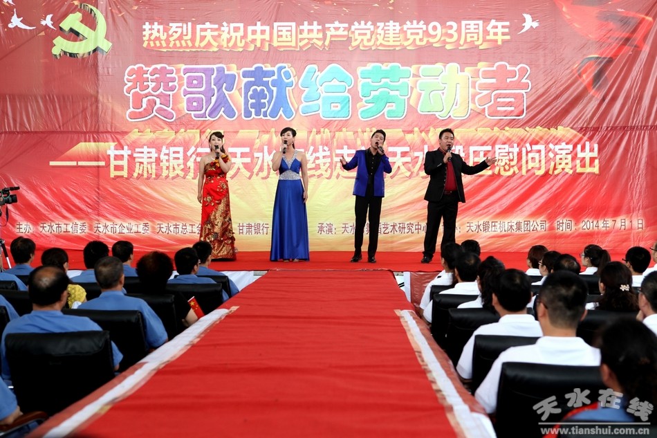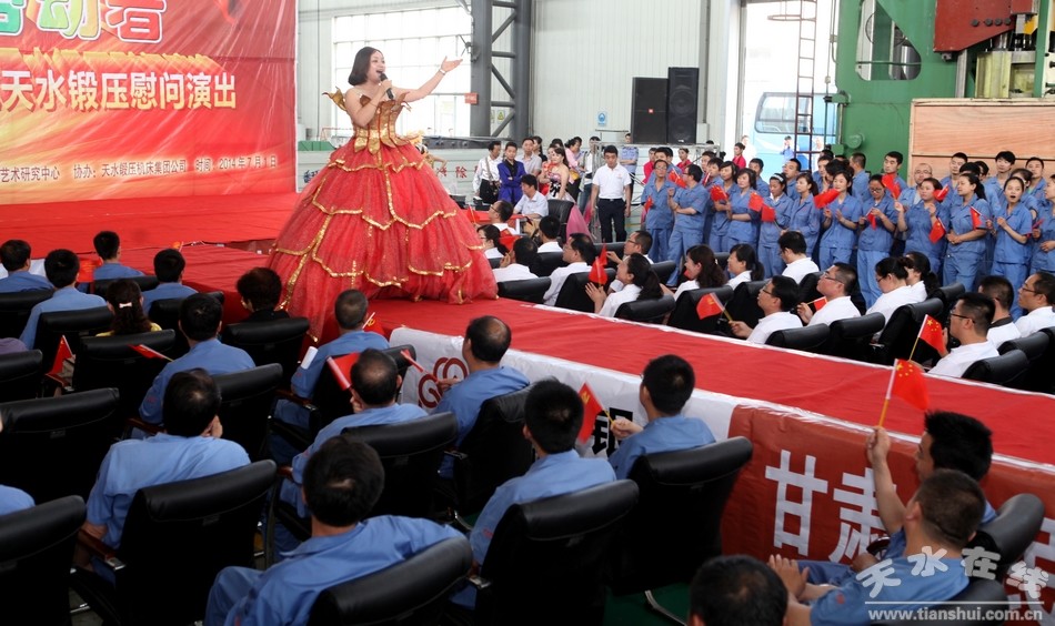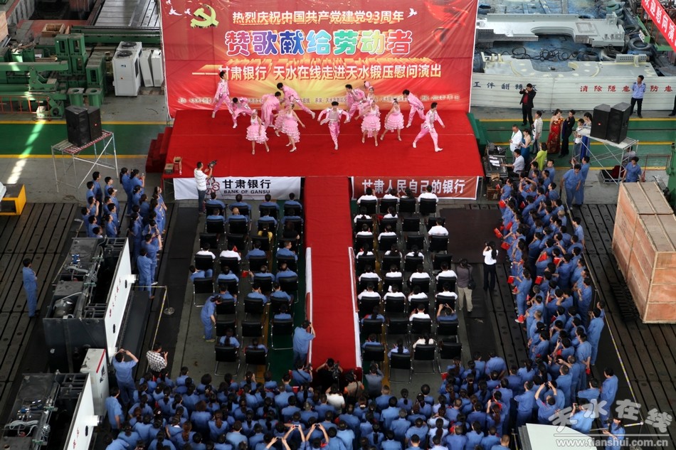 七月的天空流光溢彩,绚丽多姿;七月的大地欢歌笑语,彩旗飞扬。在我们共同庆祝中国共产党93周年华诞的美好时刻,带着对党的生日的祝福,带着对劳动者的赞美,7月1日上午,由天水市工信委、天水市企业工委、天水市总工会主办,甘肃银行、天水在线承办,天水市歌舞团承演,天水锻压机床集团协办的“赞歌献给劳动者—— 甘肃银行 天水在线走进天水锻压慰问演出”在天水锻压公司三分厂重型装配车间火热举行。天水市企业工委副书记曹秀明,天水市总工会副主席刘云芳,甘肃银行天水办事处主任陈金辉,天水锻压集团党委书记、董事长吴辉及甘肃银行职员和天水锻压生产一线的500多名员工观看了演出。