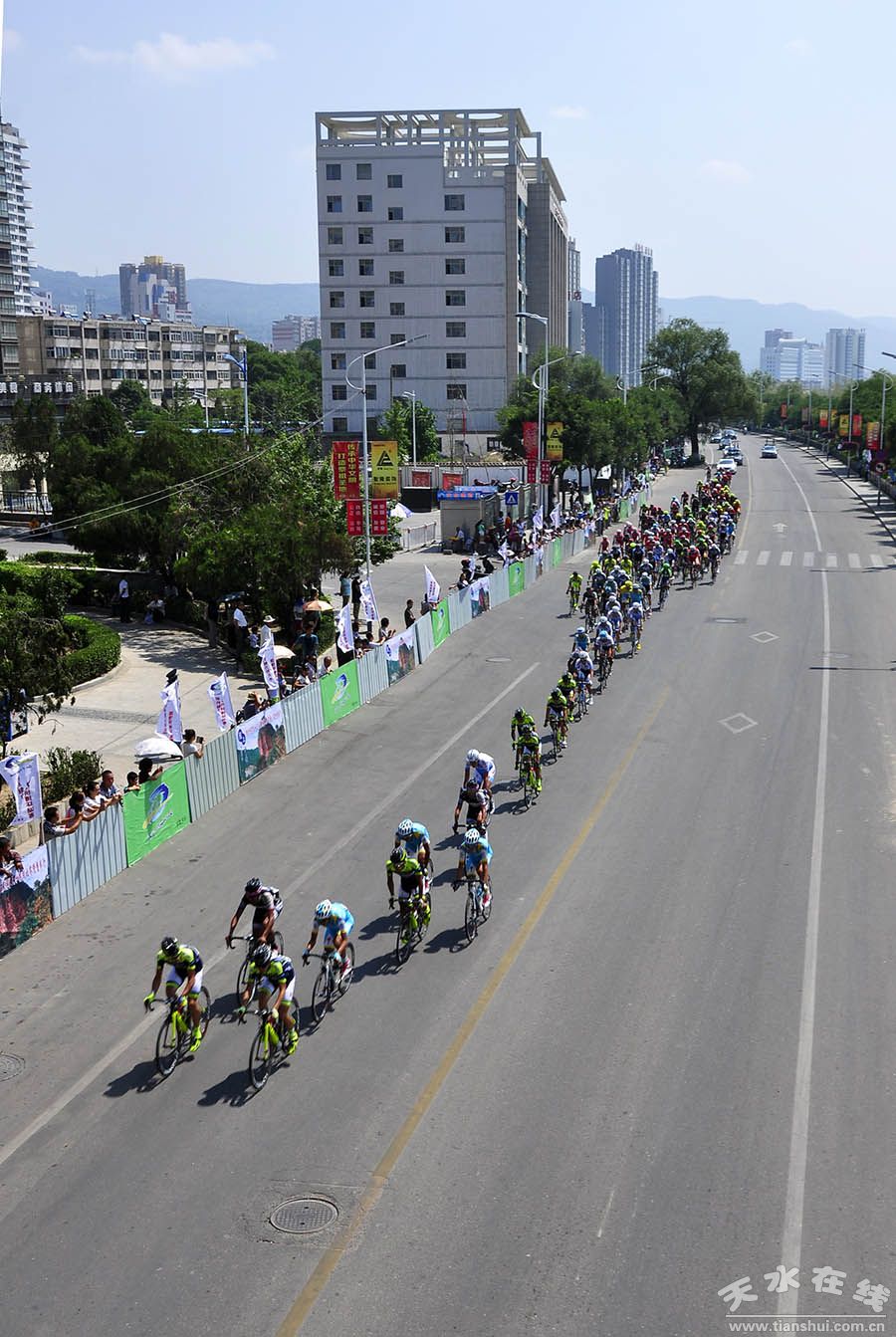 (7月15日上午,第十三届环青海湖国际公路自行车赛第九赛段(天水绕圈赛)在天水主城区隆重举行。)