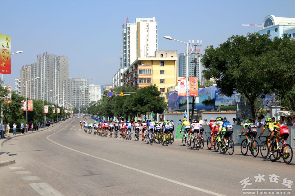 (7月15日上午,第十三届环青海湖国际公路自行车赛第九赛段(天水绕圈赛)在天水主城区隆重举行。)