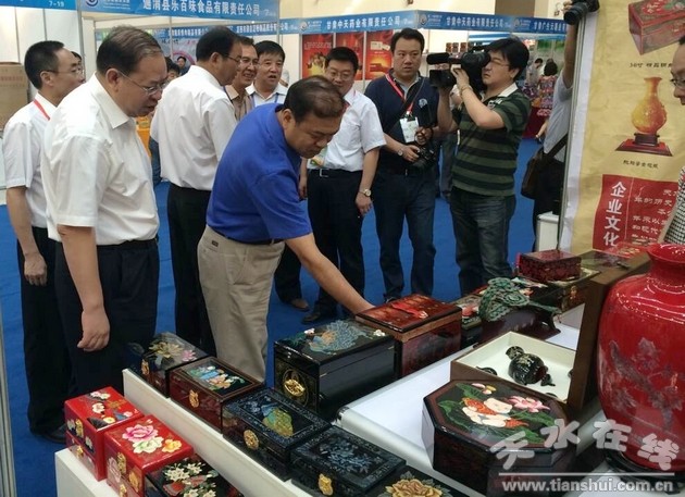 本届“兰洽会”商品贸易展,省上分配我市十二个标准展位,我市共组织16家企业参展,展销商品有21个大类300多个品种。主要包括天水漆器、武山鸳鸯玉、清真食品、甘谷杂粮、秦安花椒、天河春系列酒、武山龙泉柳编等。