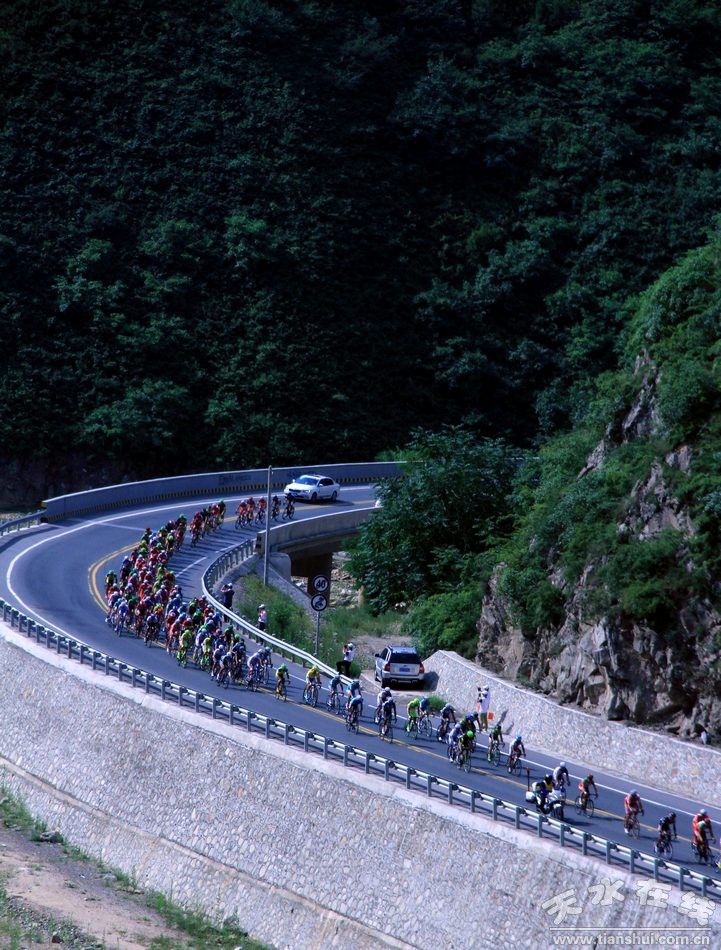 (第十三届环青海湖国际公路自行车赛清水赛段经小泉峡刘秀洞路段 李建林 摄)