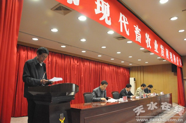 10月24日,天水市现代畜牧业发展现场会在天水迎宾馆召开,副市长霍卫平出席会议。会上秦州、张家川、麦积等县区,市政府金融办,邮政银行天水分行相关负责人从出台政策扶持、引进项目、打造品牌、强化金融支撑等方面介绍了各自发展现代畜牧业取得的成绩和好的经验。