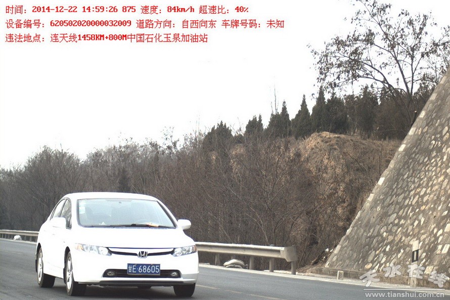 ▲甘E68605(车辆所有人:吴琼)于2014年12月22日14时59分在310国道天巉公路超速行驶,依据《中华人民共和国道路交通安全法》90条、《甘肃省道路交通安全条例》第一项之规定,处以200元罚款,记6分。