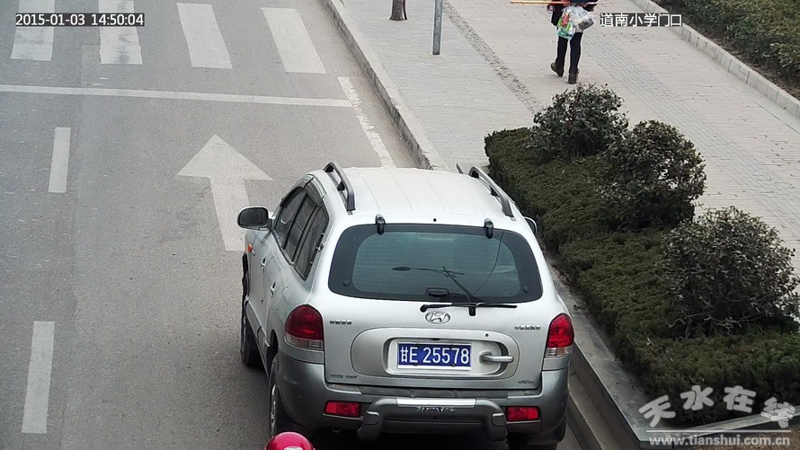 ▲甘E25578(车辆所有人:王平顺)于2015年1月3日14时50分在麦积区道南小学门口违法停放,依据《道路交通安全法》第93条第2款、《甘肃省道路交通安全条例》第82条第10项之规定处100元罚款。