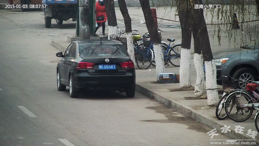▲甘EC2899(车辆所有人:张红亮)于2015年1月3日9时07分在麦积区道南小学门口违法停放,依据《道路交通安全法》第93条第2款、《甘肃省道路交通安全条例》第82条第10项之规定处100元罚款。