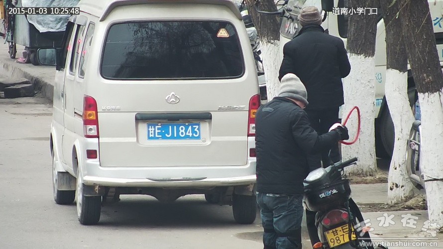 ▲甘EJ1843(车辆所有人:景杰)于2015年1月3日10时25分在麦积区道南小学门口违法停放,依据《道路交通安全法》第93条第2款、《甘肃省道路交通安全条例》第82条第10项之规定处100元罚款。 |