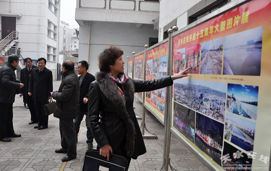 1月15日上午,天水市第六届人民代表大会第四次会议在秦州剧院隆重开幕。在会议开始前,副市长温利平观看了“天水在线成立十五周年大型图片展”。