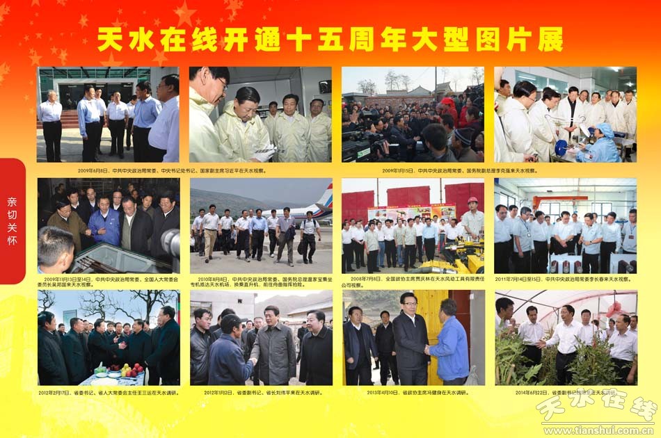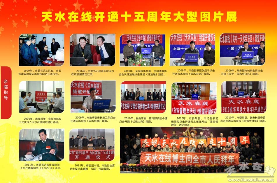 十五年间,天水在线覆盖到天水的角角落落,影响到天水人生活的方方面面。天水在线拍摄的上百万张图片,用镜头真实记录了发生在天水大地上的大事要事,成为天水在线的宝贵财富。在今年“两会”期间,天水在线举办“天水在线成立十五周年大型图片展”。旨在展示天水在线成立十五年来见证记录天水发展中的部分重大事件与辉煌成就,进一步激发全市人民热爱天水、建设天水的热情,为推动天水跨越发展和建设区域性现代化大城市做出新的更大贡献。