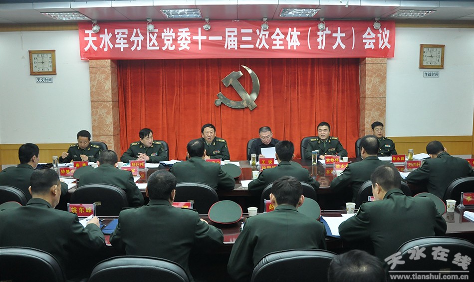 1月16日,天水军分区党委十一届三次全体(扩大)会议召开。市委书记、军分区党委第一书记王锐出席会议并强调,天水军分区党委要着眼实现党在新形势下的强军目标,坚持依法治军,从严治军,着力破解制约国防和军队建设的突出问题,狠抓各项任务落实,努力推动我市国防后备力量和部队建设再上新台阶。市委常委、天水军分区司令员李建中出席会议并讲话。