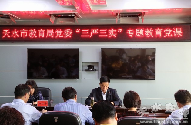 5月27日,天水市教育局党委举办“三严三实”专题教育辅导党课,党委书记、局长苏定武同志作了题为《努力践行“三严三实”,推动全市教育事业科学发展》的党课专题报告,并对局直教育系统开展专题教育进行安排部署。