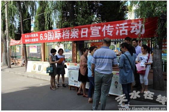 6月9日,天水市档案局、秦州区档案局在秦州区东团庄社区开展“6.9”国际档案日宣传活动。这次宣传活动的主题是“档案——与你相伴”,宣传活动主要以图文并茂的方式向广大人民群众展示《档案与人类文明》、《档案违法违纪行为处分规定》挂图以及向群众散发《档案法》、《甘肃省城市社区档案管理办法》等法律法规和《中国的世界记忆遗产》等宣传资料,向群众宣传中办国办《意见》和省委办公厅省政府办公厅《实施意见》有关精神。主要的目的是让全社会更多的人了解档案文化、树立档案意识、参与档案工作,让档案从养在深闺人未知,逐步地走入寻常百姓家。进一步拉近了档案与人民生活的距离,增强了社会的档案意识和档案法制观念,为档案部门更好地发挥服务社会、服务群众、服务民生的职能营造了良好的社会氛围。(王雪瑞)