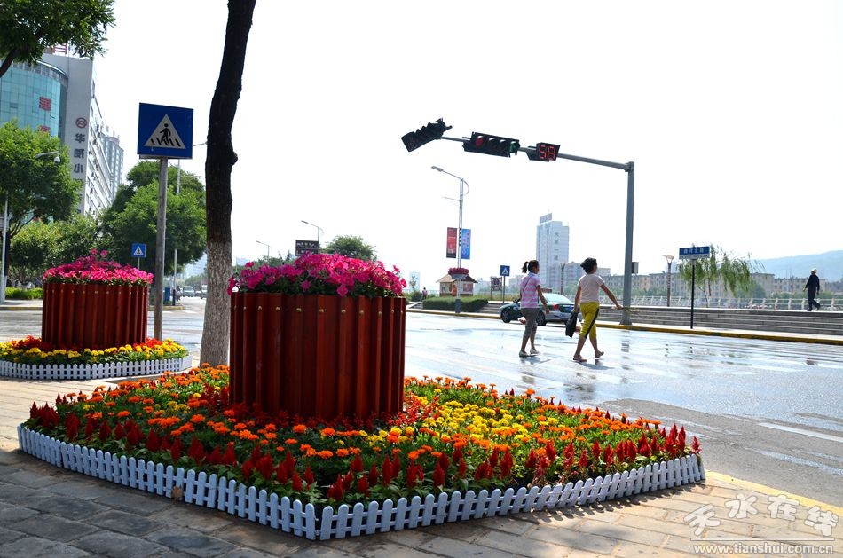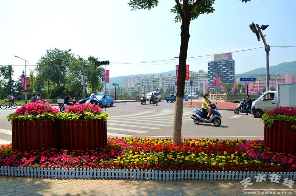 近日,记者在秦州区园林处了解到,本次鲜花美化工程为突出天水特色、彰显地方文化底蕴,以“锦绣天水、十里画卷”为设计主题,鲜花美化以龙城广场为中心向四周辐射,通过花箱与色彩丰富的花带组合搭配,使整个城区沉浸在快乐、和谐、喜庆的节日氛围中。鲜花摆放采用“两出入口”、“三广场”、“六道路”、“四什字”的摆放格局。“两出入口”即秦麦高速出入口、天水西高速公路出入口;“三广场”即龙城广场、文庙小广场、伏羲广场;“六道路”即民主路、建设路、藉河北路、双桥路、女娲路、伏羲路;“四什字”为青年南北路什字、公园路什字、合作路什字、藉滨大桥什字。