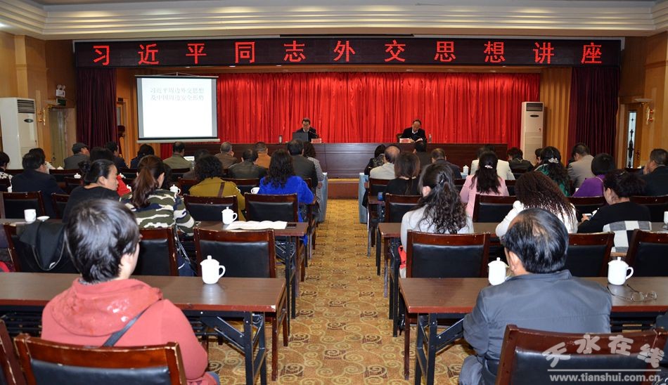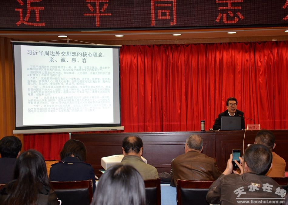10月23日,民建天水市委员会邀请省政协常委、省民建专职副主委杨贵言,为全市民主党派广大成员作了习近平同志外交思想专题讲座。市委统战部副部长邢赟主持会议。